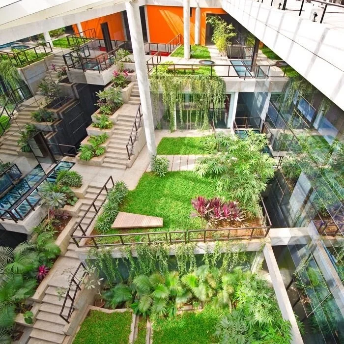 SAMA created a wedge-shaped space between the two wings of the buildings which were conceptualised as a valley between two rock outcrops. The wedge shape created a ‘ventury’ effect and the breeze generated reduced the heat from inside the office blocks. A lush ‘hillock’ was created to act as an effortless walk up or down and between the two wings, creating an experience which engages and connects with nature. Common activities placed in the central area were camouflaged with green curtains and plants. Landscaped steps lead to various levels and connected the areas. The space included also a large open water body, which reflected the existing environment filled with greenery.